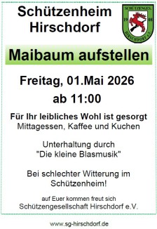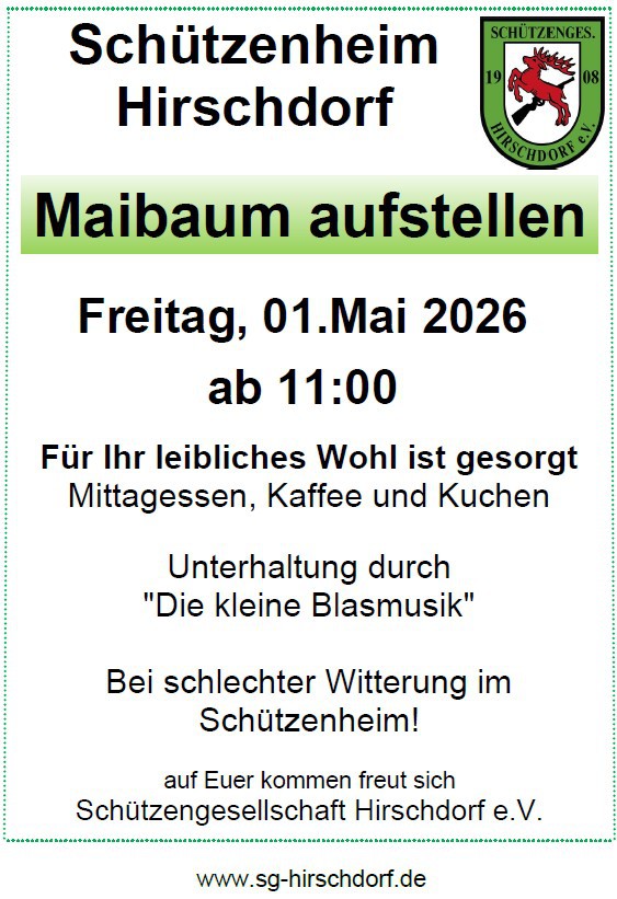 | Maibaum aufstellen vor dem Schützenheim in Hirschdorf | Freitag | 01.05.2026 | 11:00 |
